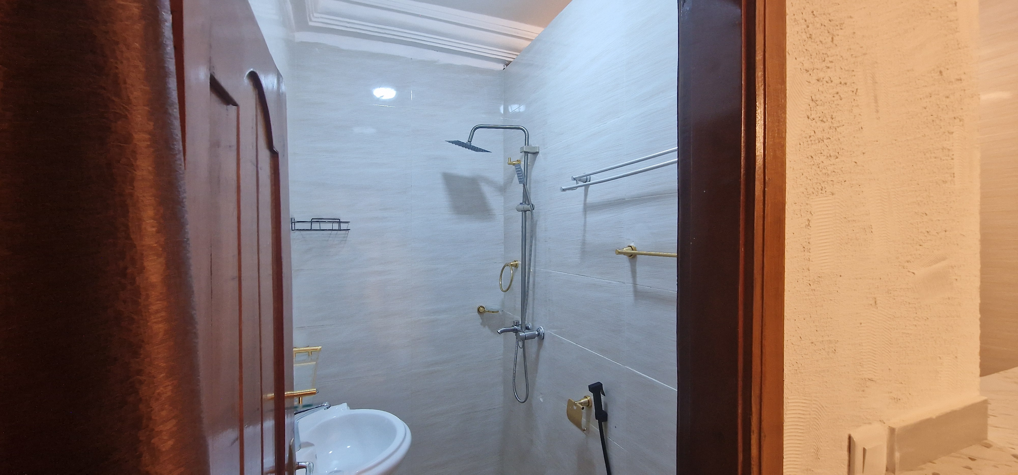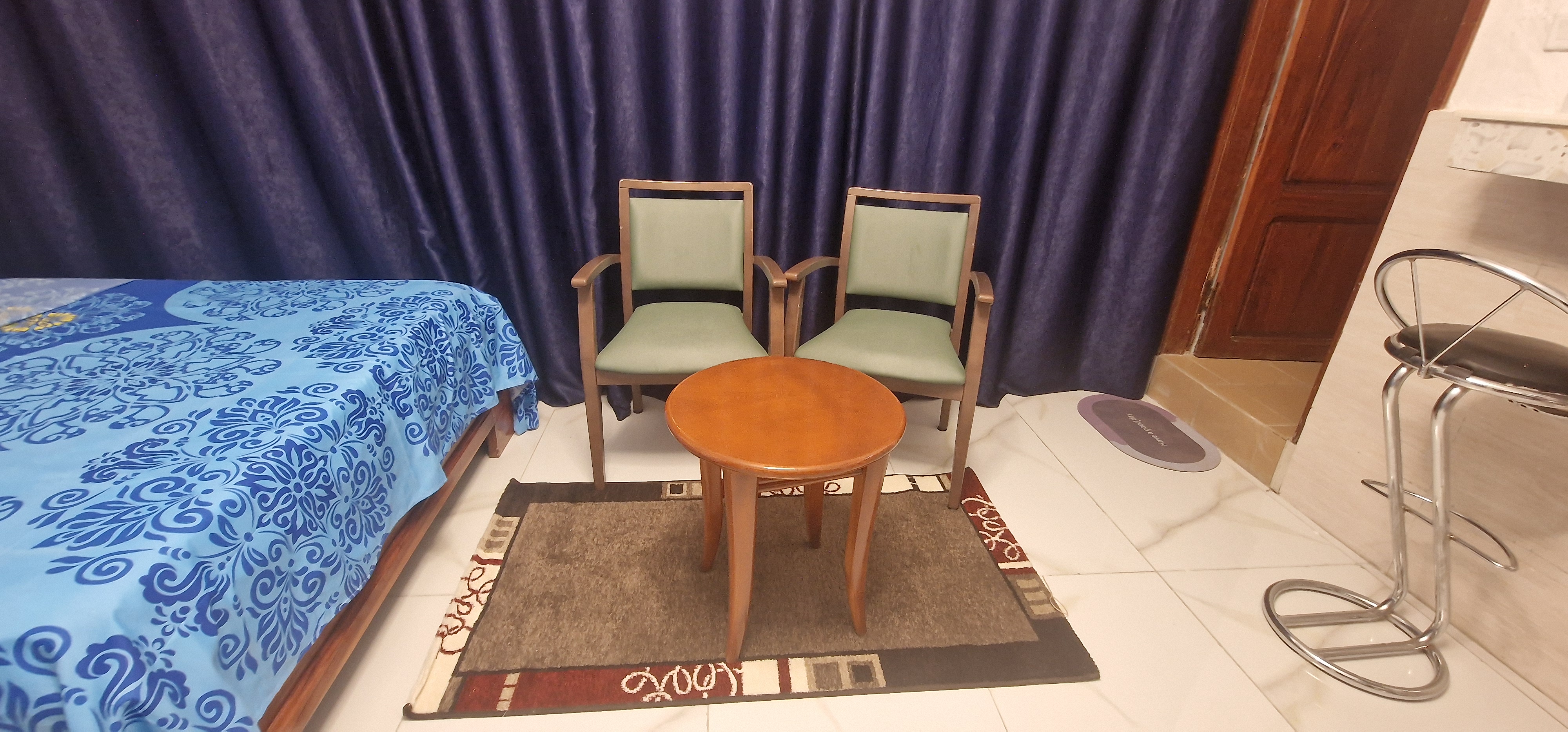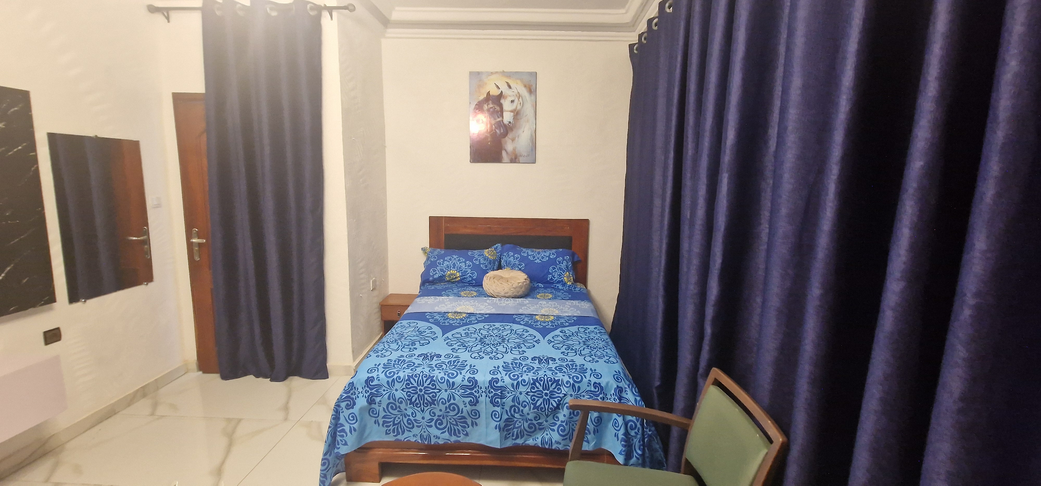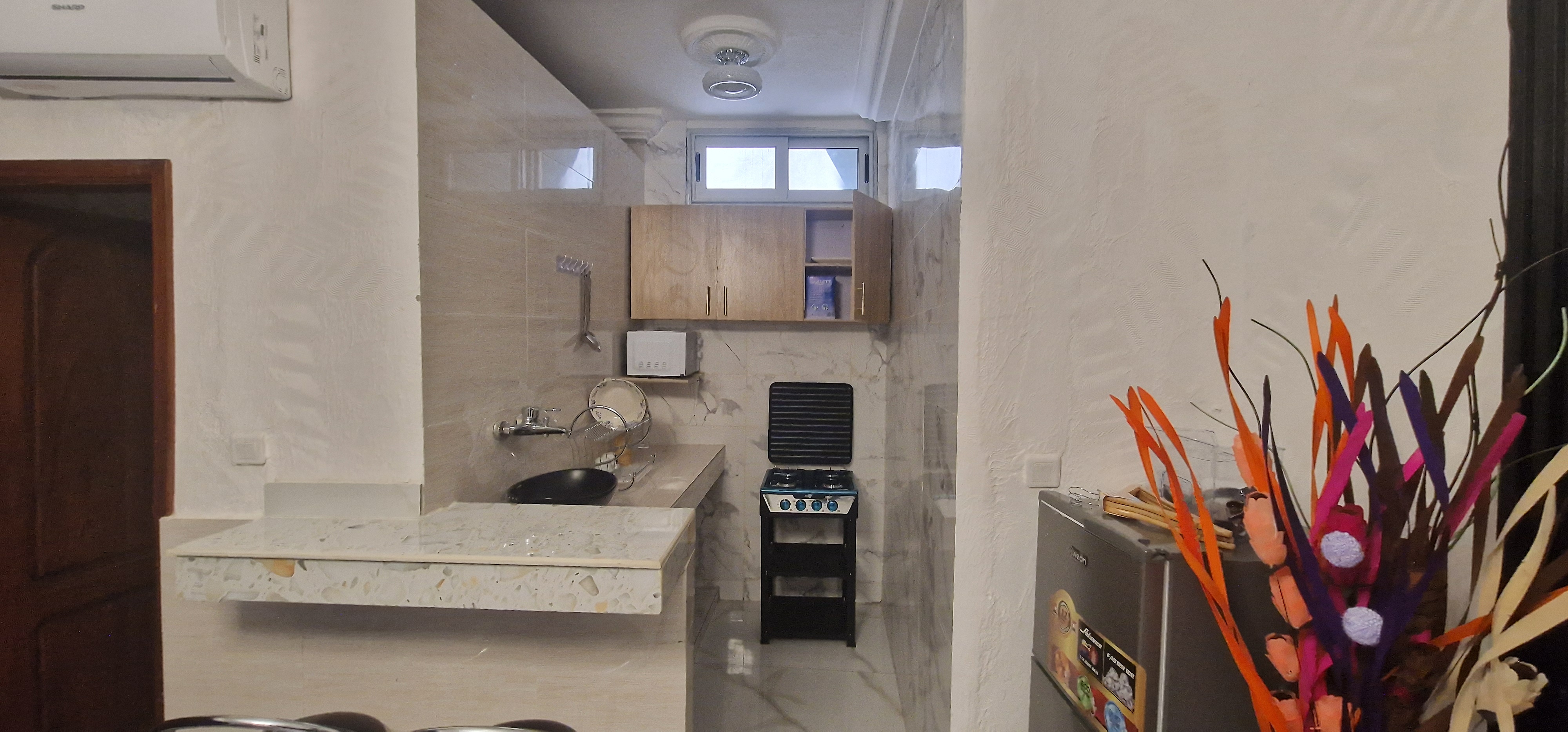 Ce studio meublé est équipé d’un lit confortable, d’une télévision et d’une table accompagnée de trois chaises. La cuisine dispose de tous les accessoires nécessaires, ainsi que d’un réfrigérateur. La salle de bain est également entièrement équipée.